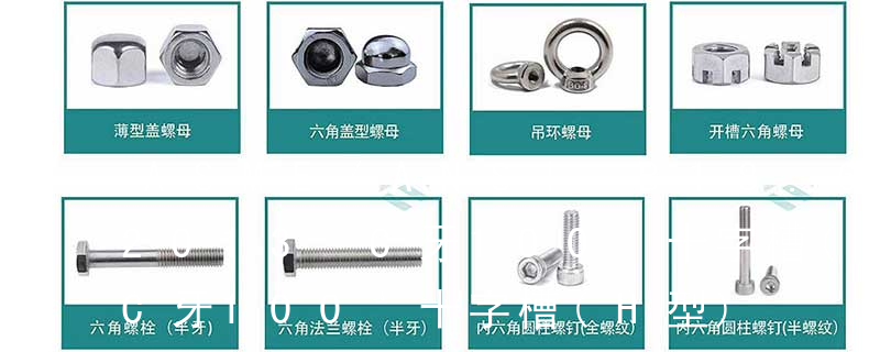 平杯)、半圓頭內六角螺釘(圓杯)、十字槽盤頭機螺釘、十字槽沉頭機螺釘、十字槽大扁頭機螺釘、十字槽盤頭自攻釘、十字槽沉頭自攻釘、十字槽大扁頭自攻釘、全牙絲桿(牙條)、六角螺母、法蘭螺母、尼龍螺母、蓋型螺母、蝶型