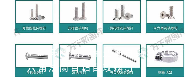 1、頭部形狀頭部形狀各式各樣。有圓頭(半圓頭)、扁圓頭、圓頭凸緣(帶墊)、扁圓頭凸緣(帶墊)、盤頭、盤頭凸緣(帶墊)、沉頭、半沉頭、圓柱頭、球面圓柱頭、喇叭頭、六角頭、六角法蘭頭、六角凸緣(帶墊)頭等。2